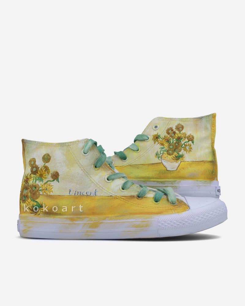 Das Hauptdesign wird nur auf der Außenseite jedes Schuhs bemalt. Die Innenseiten werden entweder mit Aquarell-/Texturverläufen dekoriert oder bleiben schlicht weiß. Dies überlassen wir dem Künstler, je nachdem, was am besten zum gewählten Design passt.
