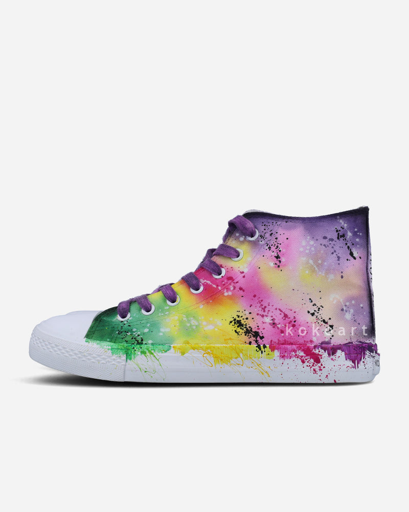 Das Hauptdesign wird nur auf der Außenseite jedes Schuhs bemalt. Die Innenseiten werden entweder mit Aquarell-/Texturverläufen dekoriert oder bleiben schlicht weiß. Dies überlassen wir dem Künstler, je nachdem, was am besten zum gewählten Design passt.