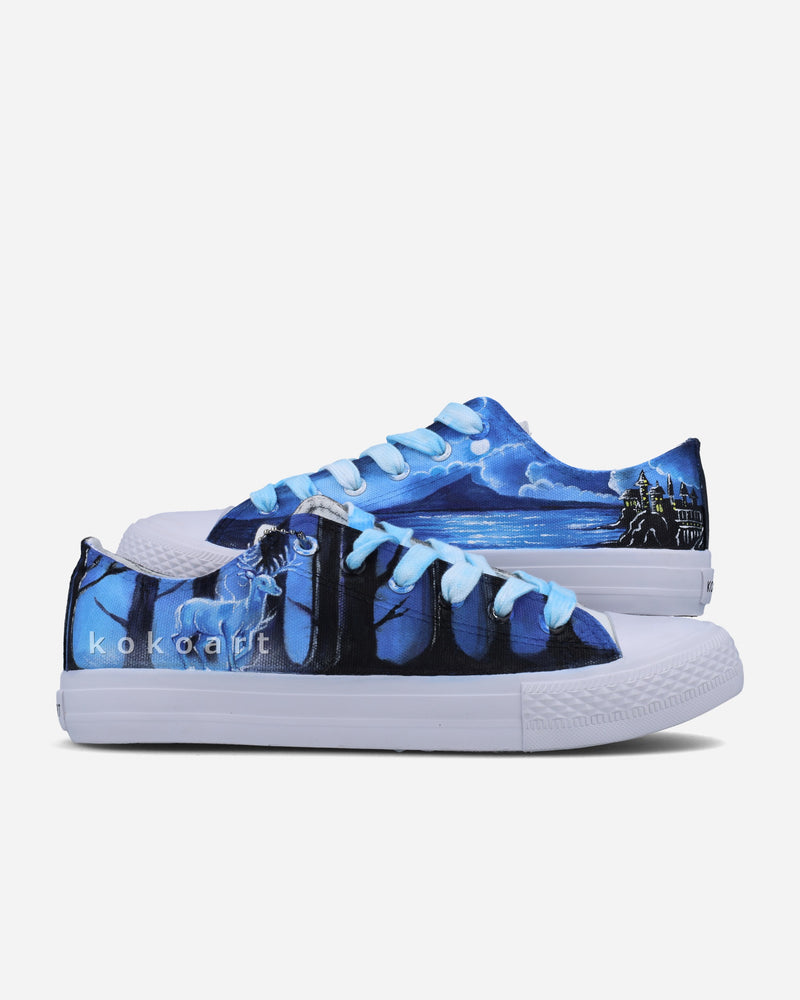 The main design is only painted on the outer side of each shoe. The inner sides are decorated with watercolour/textured shading or they are left blank white. This is left to the artist based on what goes best with the chosen design.