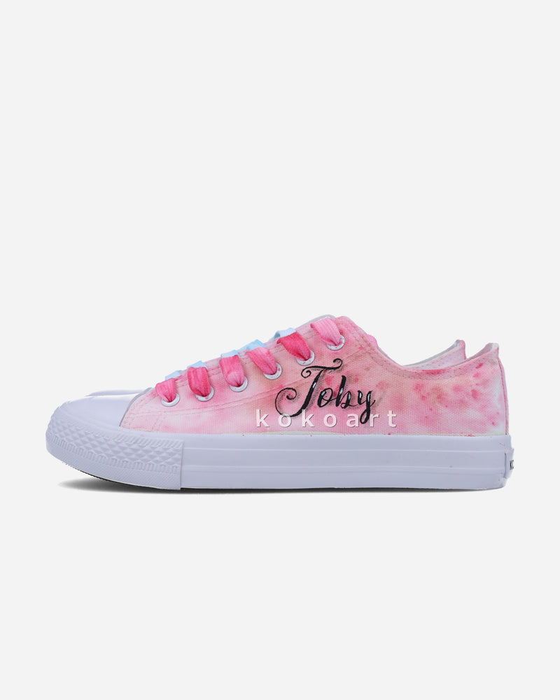 The main design is only painted on the outer side of each shoe. The inner sides are decorated with watercolour/textured shading or they are left blank white. This is left to the artist based on what goes best with the chosen design.