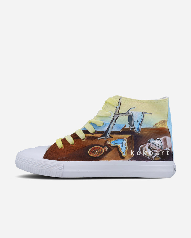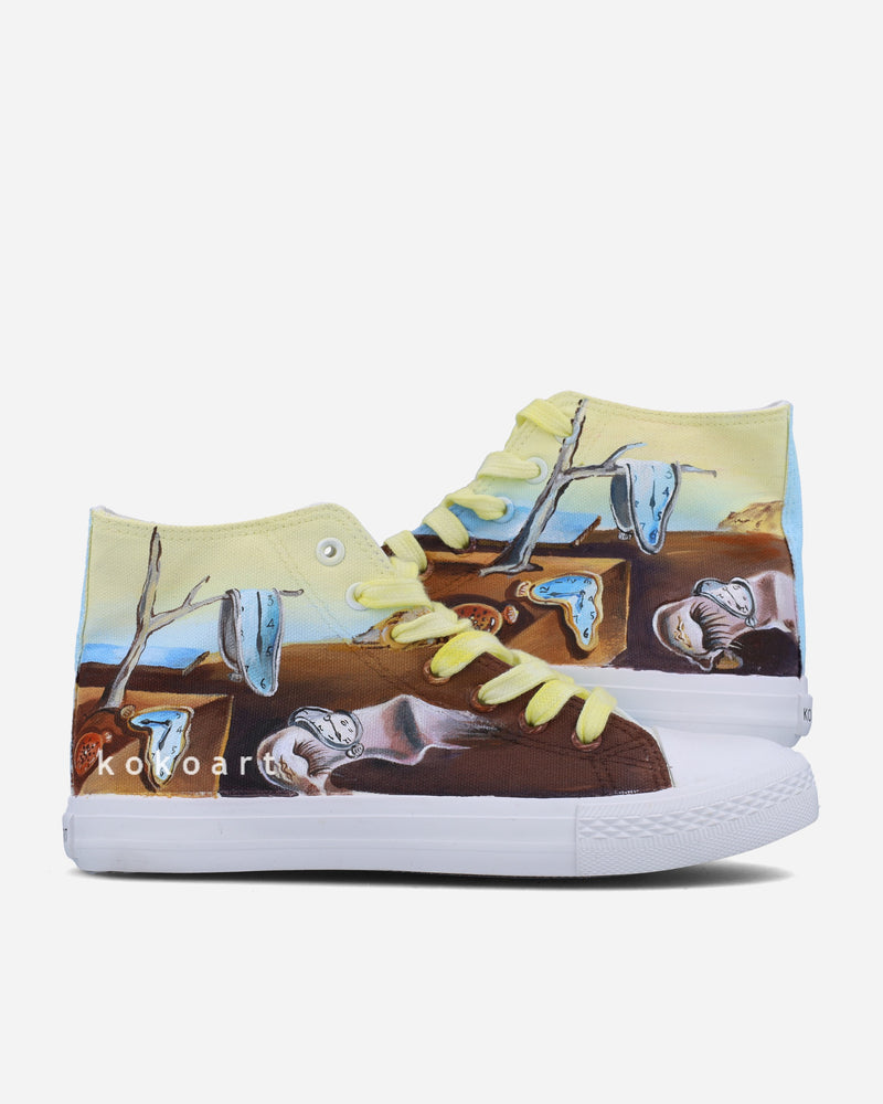 The main design is only painted on the outer side of each shoe. The inner sides are decorated with watercolour/textured shading or they are left blank white. This is left to the artist based on what goes best with the chosen design.