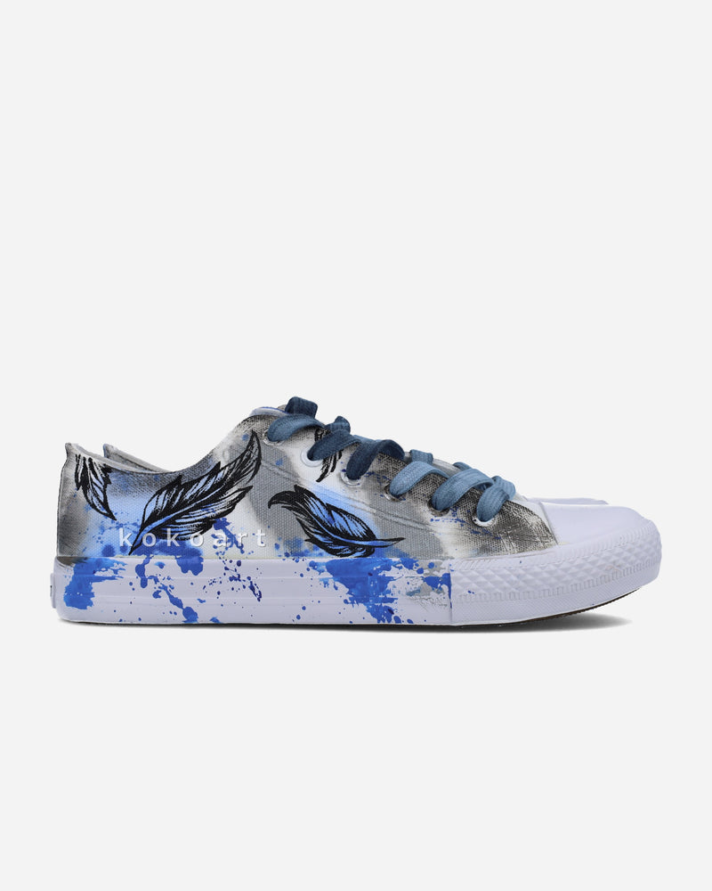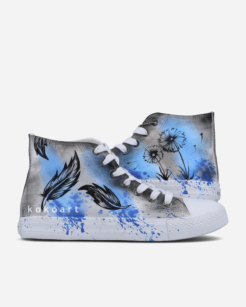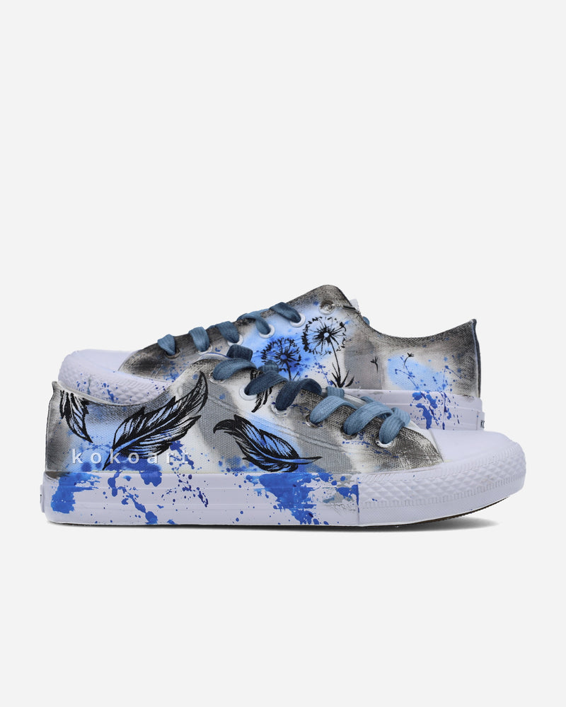 The main design is only painted on the outer side of each shoe. The inner sides are decorated with watercolour/textured shading or they are left blank white. This is left to the artist based on what goes best with the chosen design.