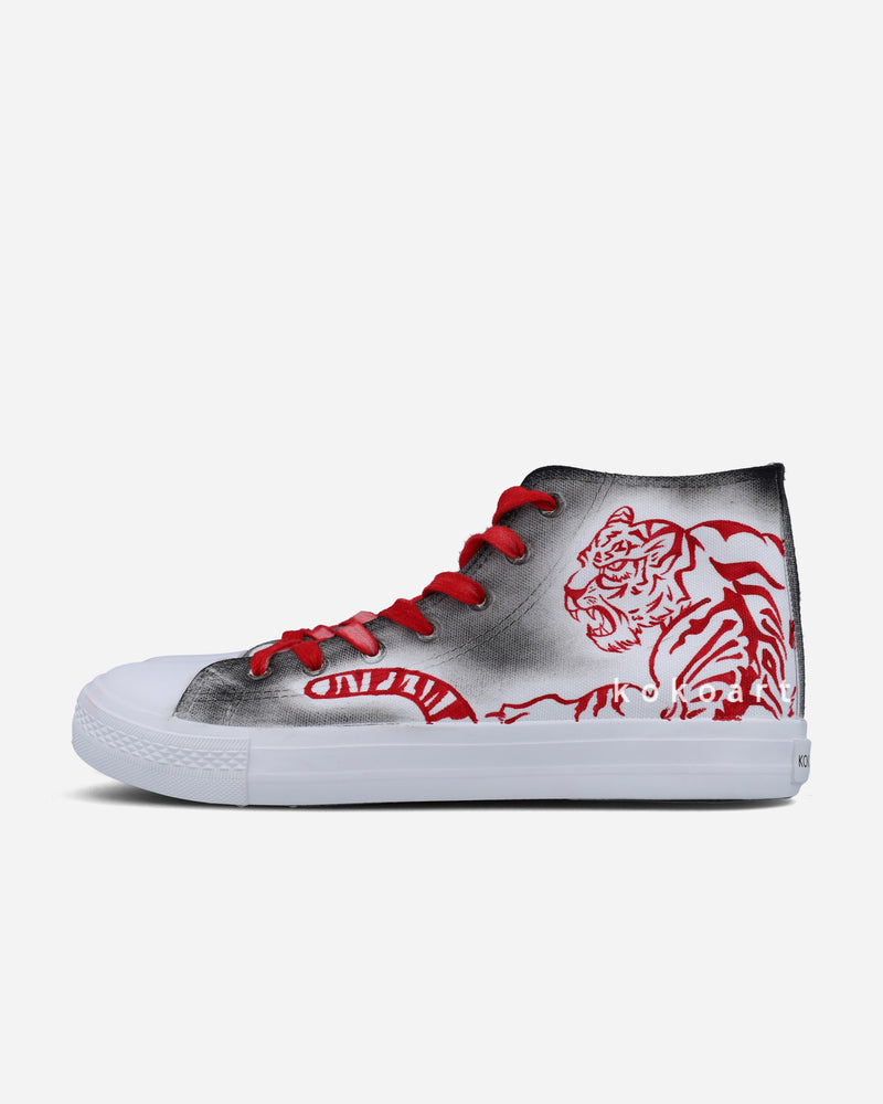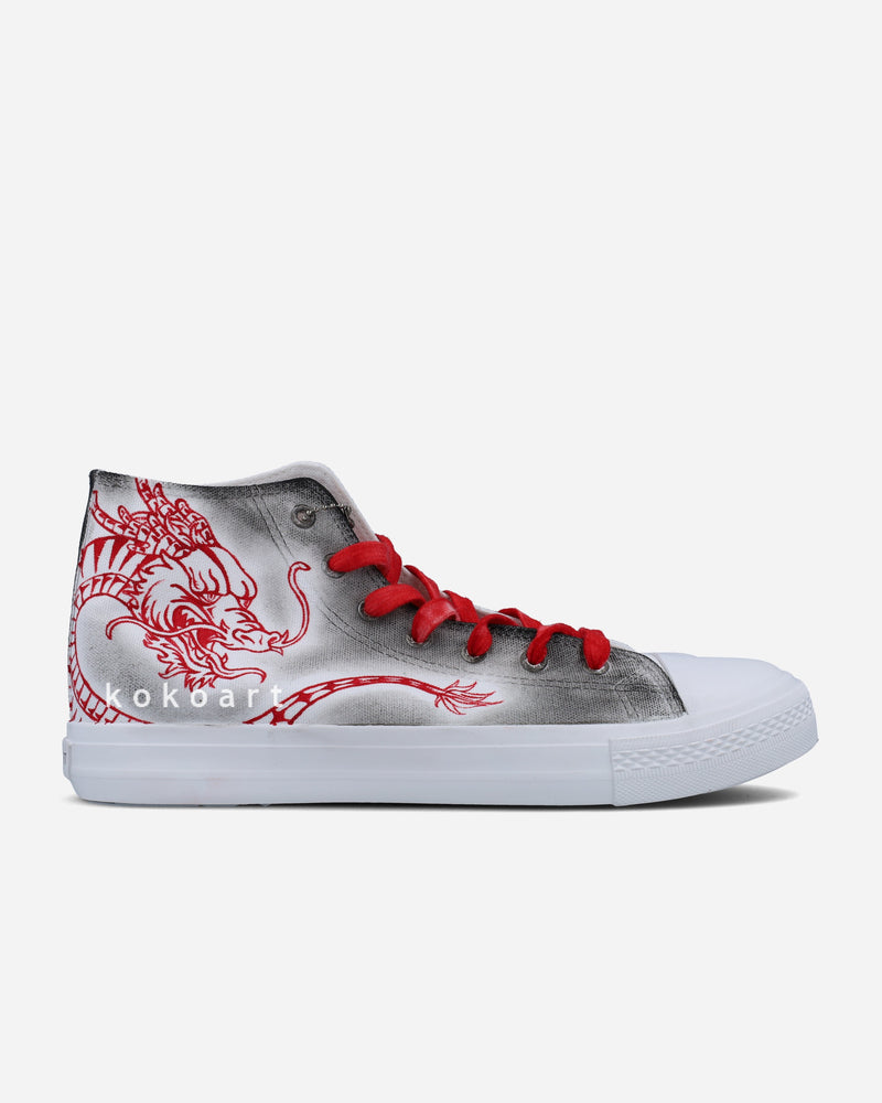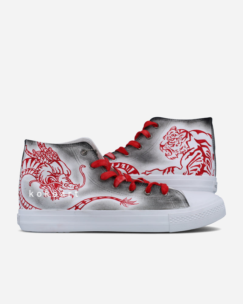 The main design is only painted on the outer side of each shoe. The inner sides are decorated with watercolour/textured shading or they are left blank white. This is left to the artist based on what goes best with the chosen design.