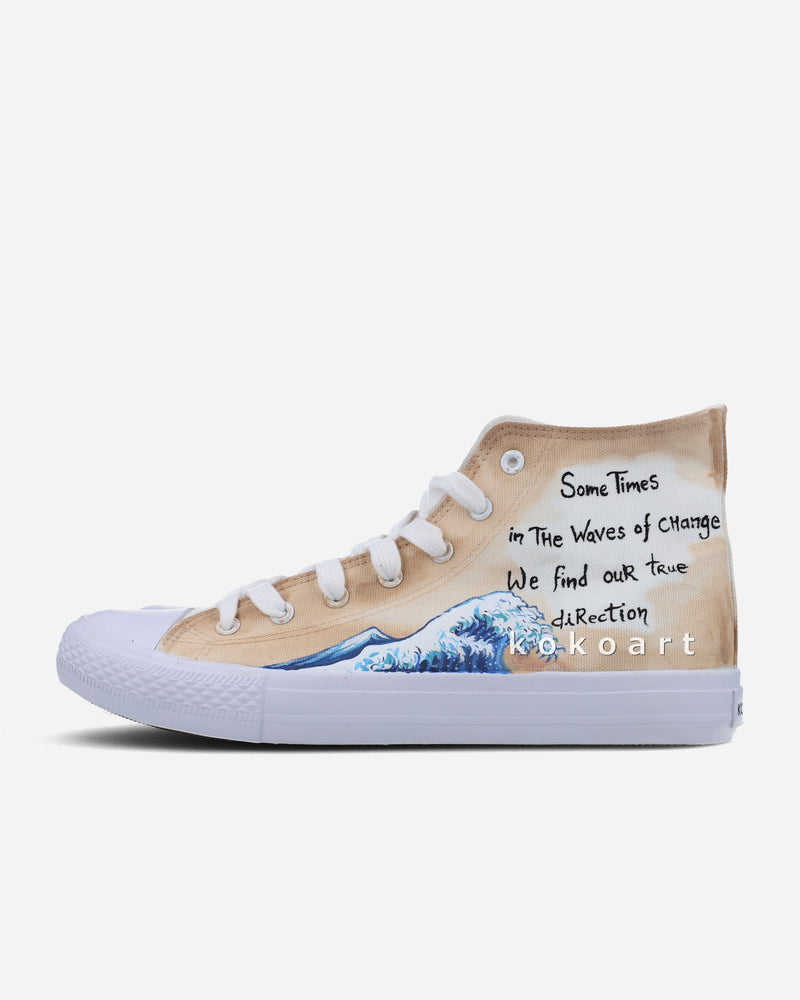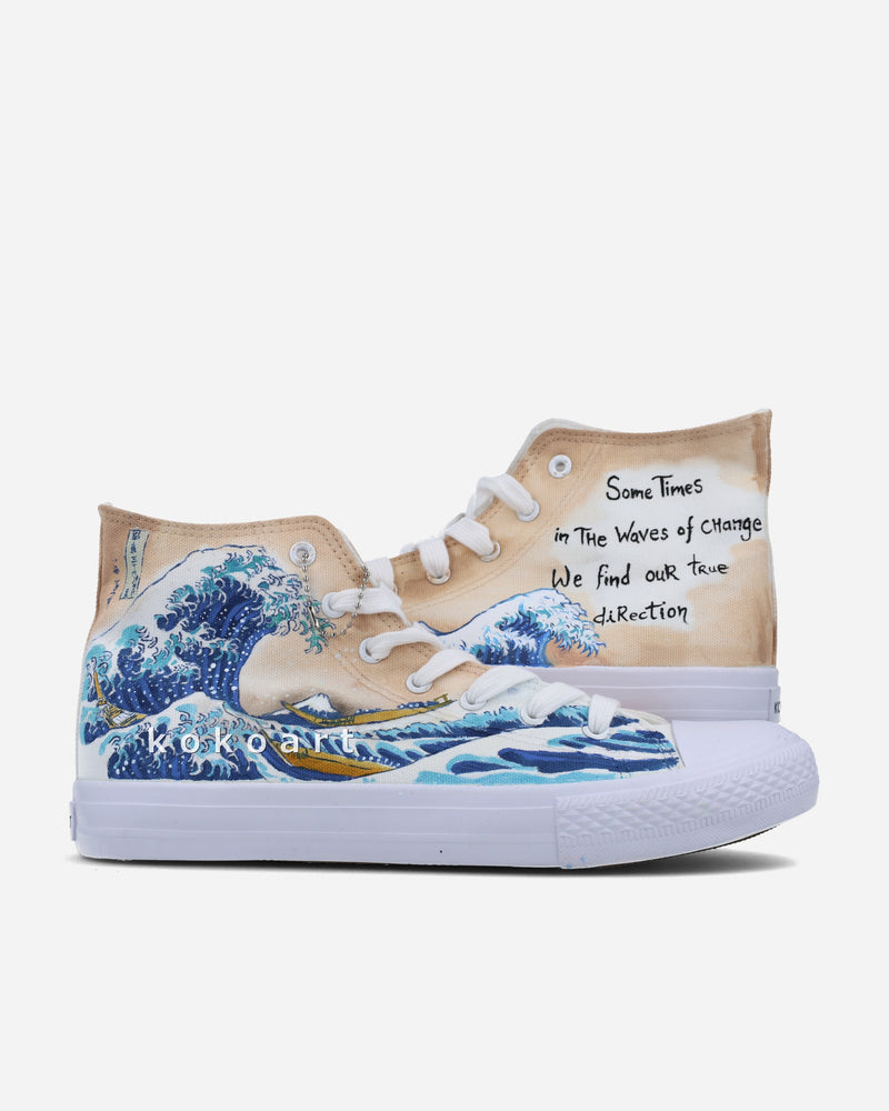 The main design is only painted on the outer side of each shoe. The inner sides are decorated with watercolour/textured shading or they are left blank white. This is left to the artist based on what goes best with the chosen design.