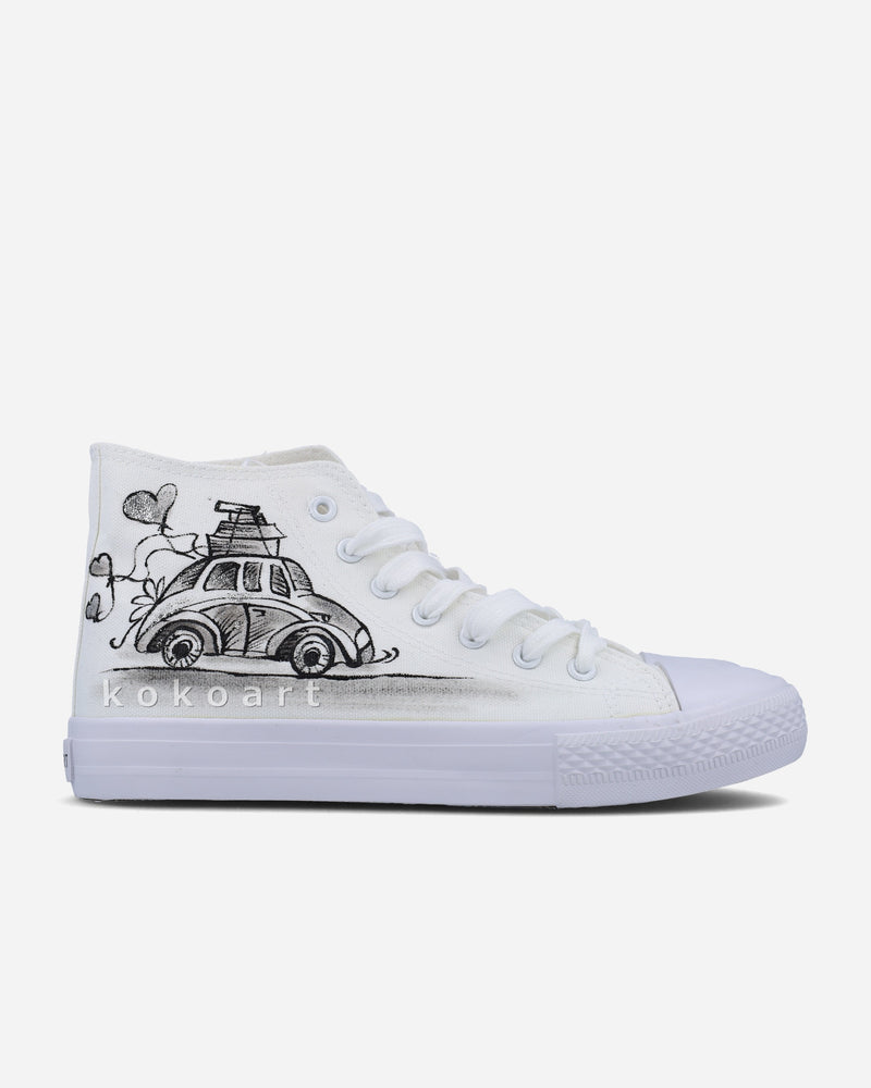 The main design is only painted on the outer side of each shoe. The inner sides are decorated with watercolour/textured shading or they are left blank white. This is left to the artist based on what goes best with the chosen design.