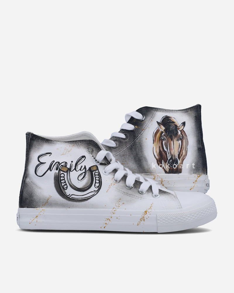 The main design is only painted on the outer side of each shoe. The inner sides are decorated with watercolour/textured shading or they are left blank white. This is left to the artist based on what goes best with the chosen design.