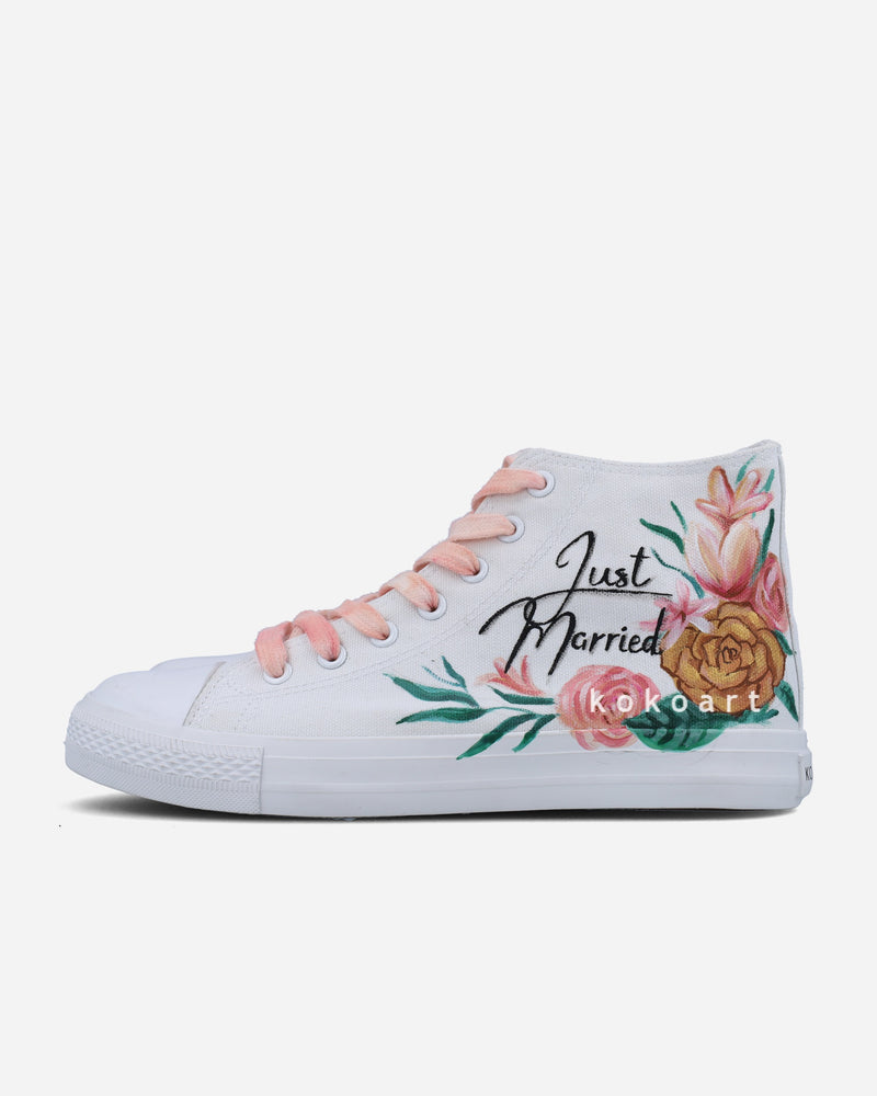 The main design is only painted on the outer side of each shoe. The inner sides are decorated with watercolour/textured shading or they are left blank white. This is left to the artist based on what goes best with the chosen design.