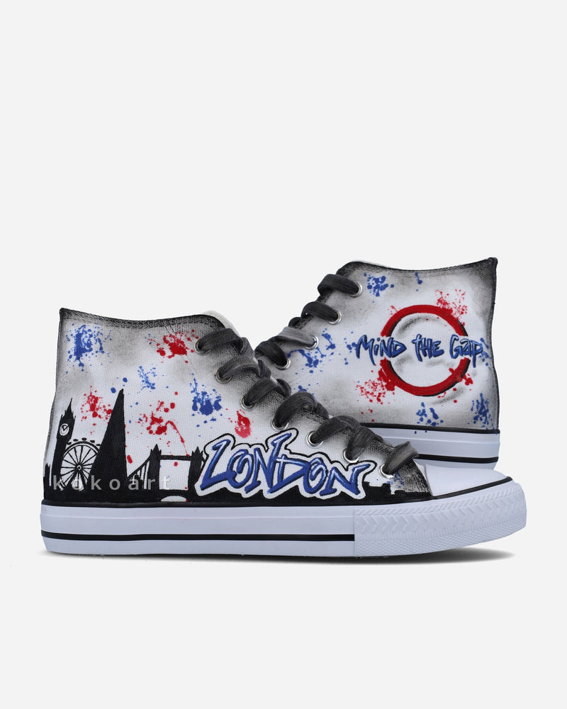 The main design is only painted on the outer side of each shoe. The inner sides are decorated with watercolour/textured shading or they are left blank white. This is left to the artist based on what goes best with the chosen design.