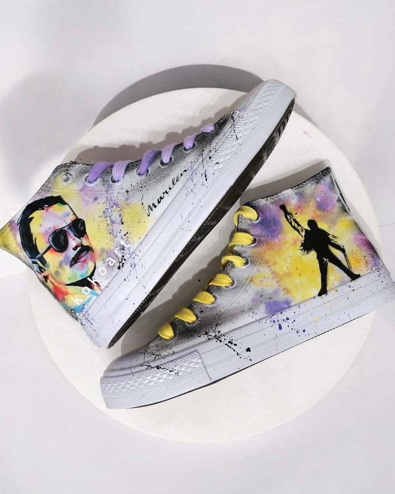 Each design can be fully customised. You can tell us in the design description box or you can upload a file with the exact customisation you wish. For example you can change the colour theme, swap a character or a portrait to your own choosing etc. You can also choose any of the four shoe styles below.