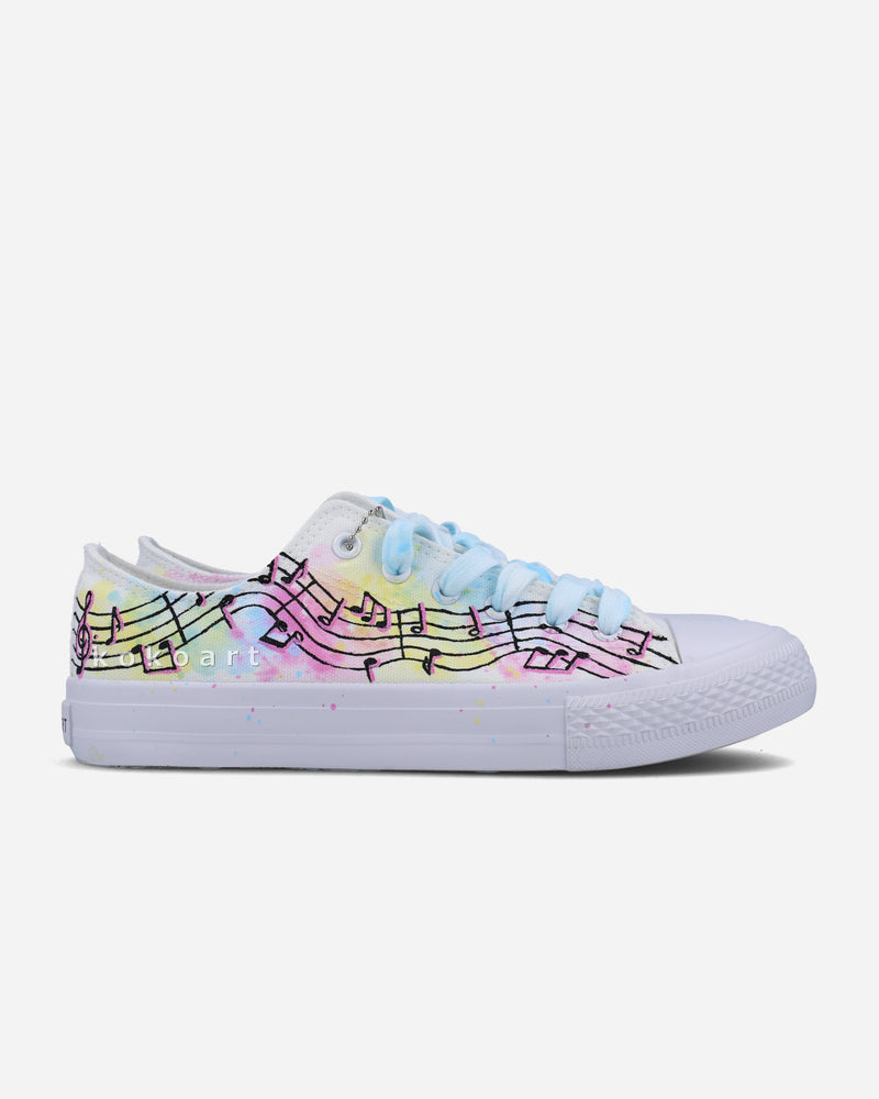 The main design is only painted on the outer side of each shoe. The inner sides are decorated with watercolour/textured shading or they are left blank white. This is left to the artist based on what goes best with the chosen design.