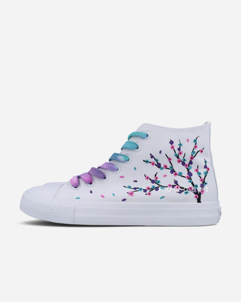 The main design is only painted on the outer side of each shoe. The inner sides are decorated with watercolour/textured shading or they are left blank white. This is left to the artist based on what goes best with the chosen design.