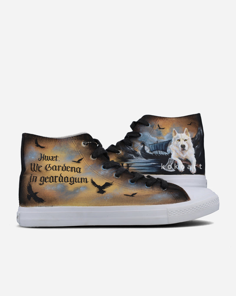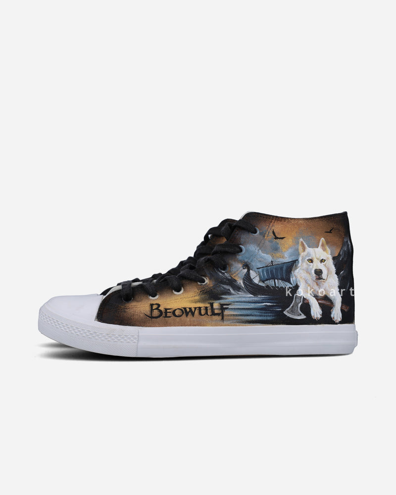 The main design is only painted on the outer side of each shoe. The inner sides are decorated with watercolour/textured shading or they are left blank white. This is left to the artist based on what goes best with the chosen design.