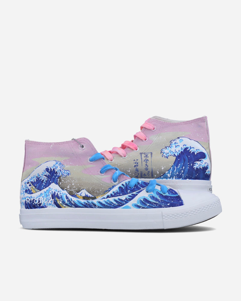 The main design is only painted on the outer side of each shoe. The inner sides are decorated with watercolour/textured shading or they are left blank white. This is left to the artist based on what goes best with the chosen design.