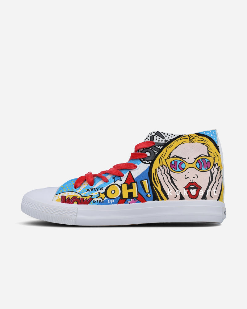 Each design can be fully customised. You can tell us in the design description box or you can upload a file with the exact customisation you wish. For example you can change the colour theme, swap a character or a portrait to your own choosing etc. You can also choose any of the four shoe styles below.