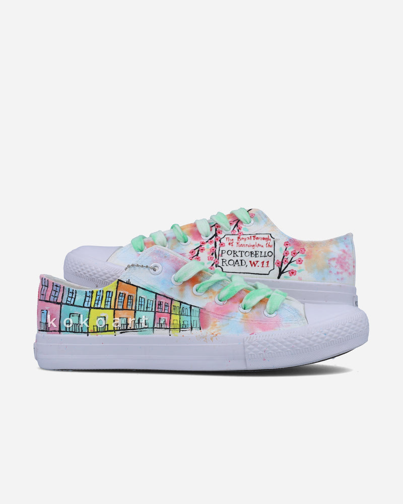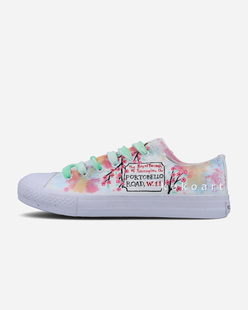 The main design is only painted on the outer side of each shoe. The inner sides are decorated with watercolour/textured shading or they are left blank white. This is left to the artist based on what goes best with the chosen design.