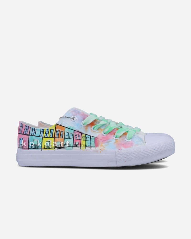 Our designs are hand painted on high quality American Recorders branded canvas shoes with waterproof fabric paint, which is then sealed and heated to ensure the longevity of the colours. Our products are also machine washable at 30 degrees.