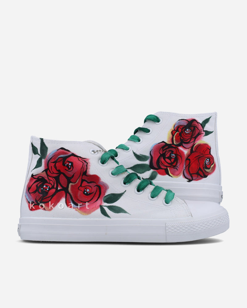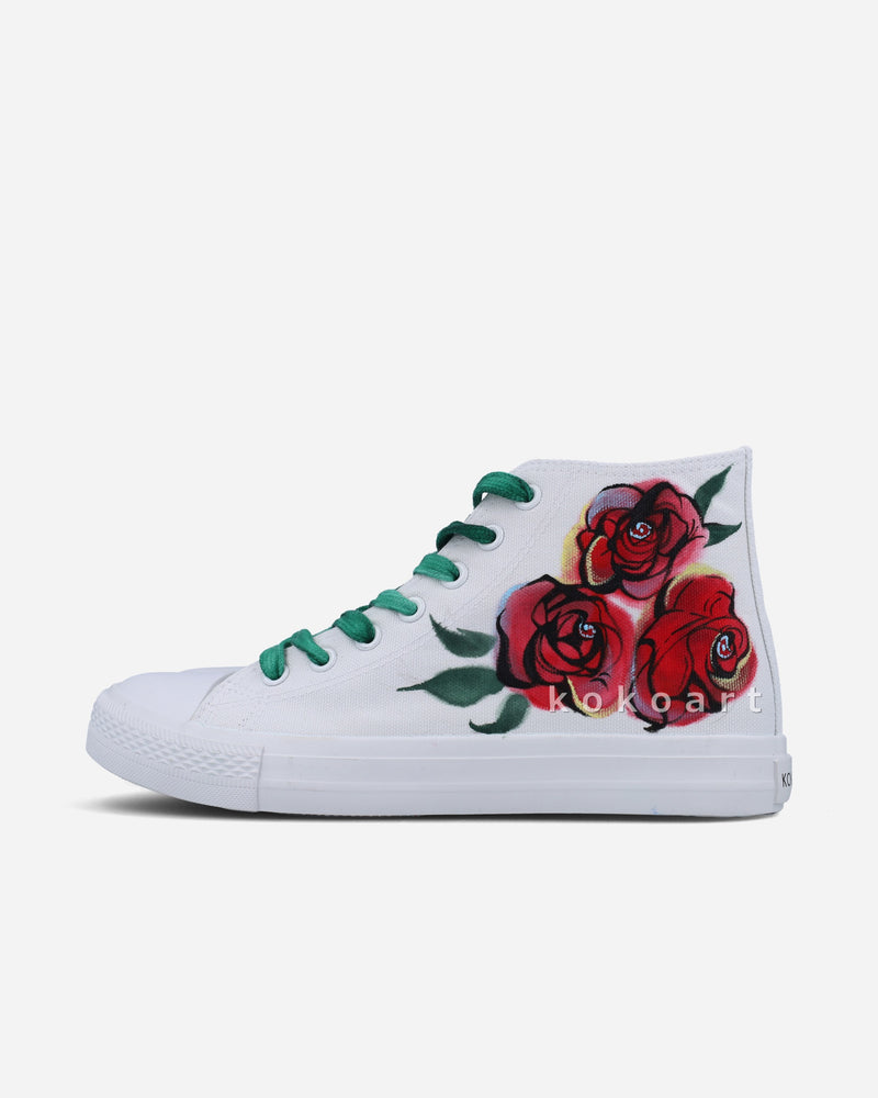 The main design is only painted on the outer side of each shoe. The inner sides are decorated with watercolour/textured shading or they are left blank white. This is left to the artist based on what goes best with the chosen design.